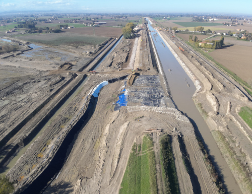In foto l'opera di protezione realizzata dalla Regione Emilia-Romagna per far confluire le acque dell'Idice verso il canale di bonifica Corla (a sinistra nell'immagine) in maniera controllata.